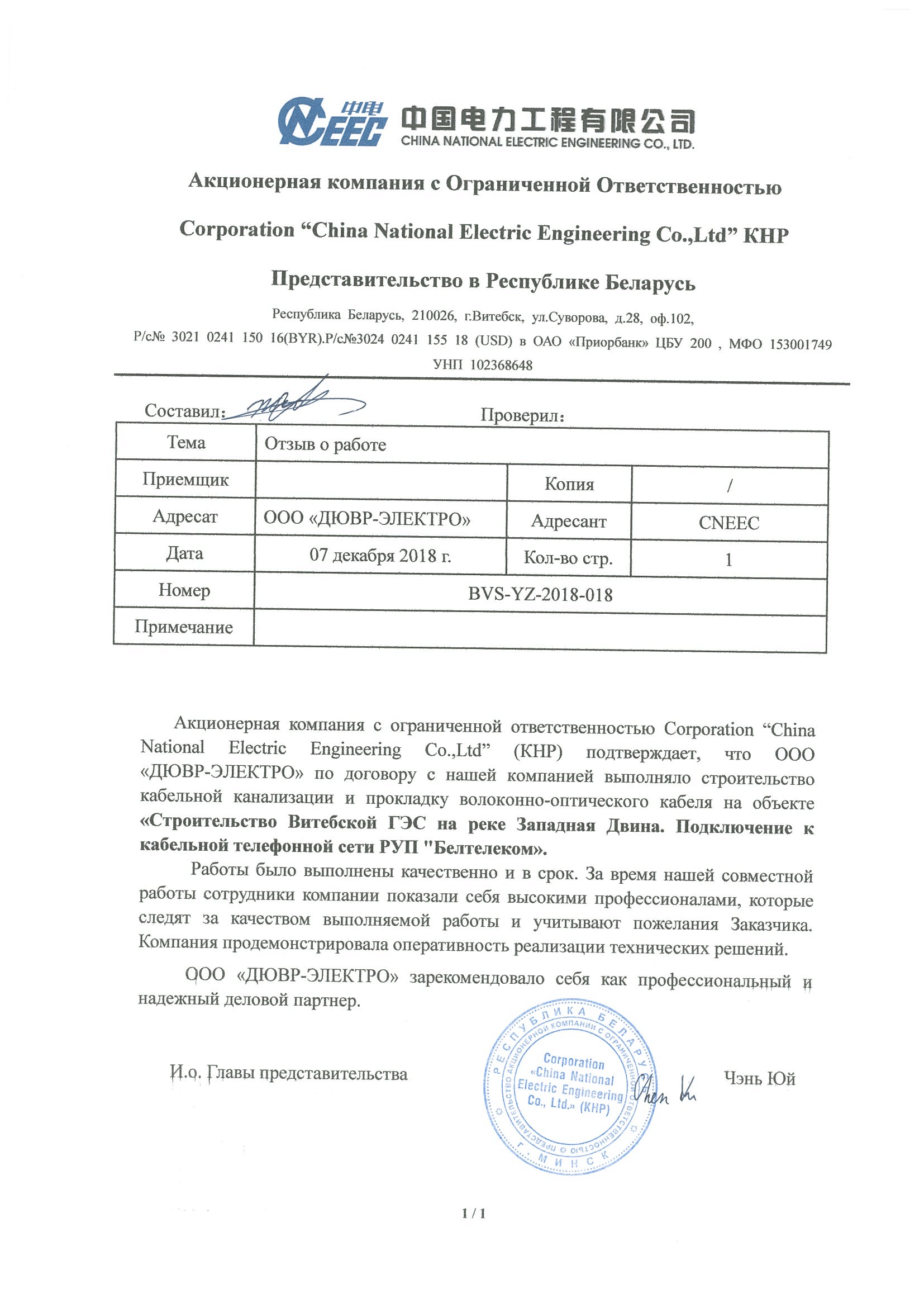 12. Отзывы от Китайской национальной корпорации электроинжиниринга ( сокращение"CNEEC")